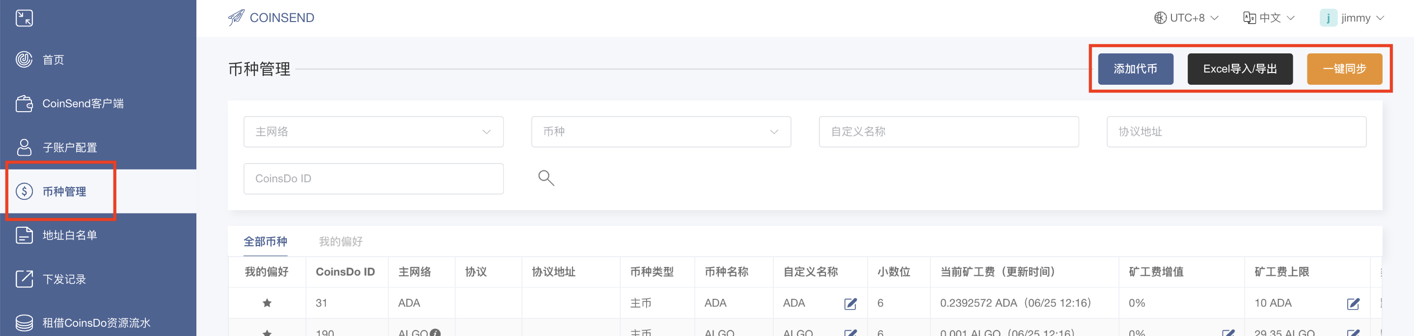 1. 主账户可以通过币种管理添加代币、执行批量设置（将当前币种管理设置详情导出成Excel文件并进行修改，然后导入修改好的Excel文件使修改后的币种管理设置详情同步到平台配置）或执行一键同步（将CoinGet中心币种设置详情同步到CoinSend中心）。