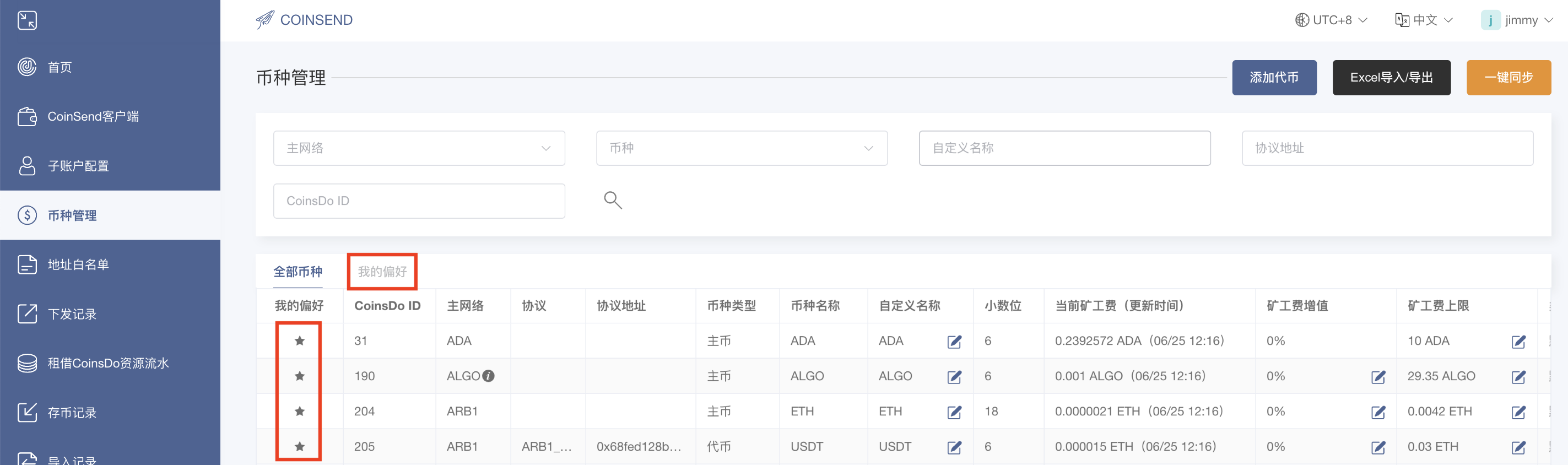 <mark style="color:red;">**备注：为指定货币点选“我的偏好”后，其货币也将同步到CoinSend中心并出现在其下发记录功能的币种选项里。**</mark>