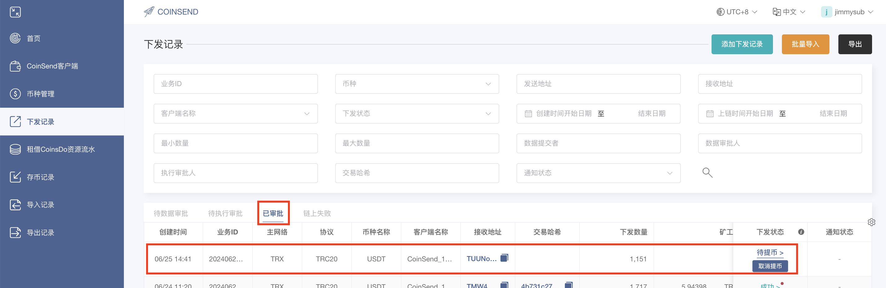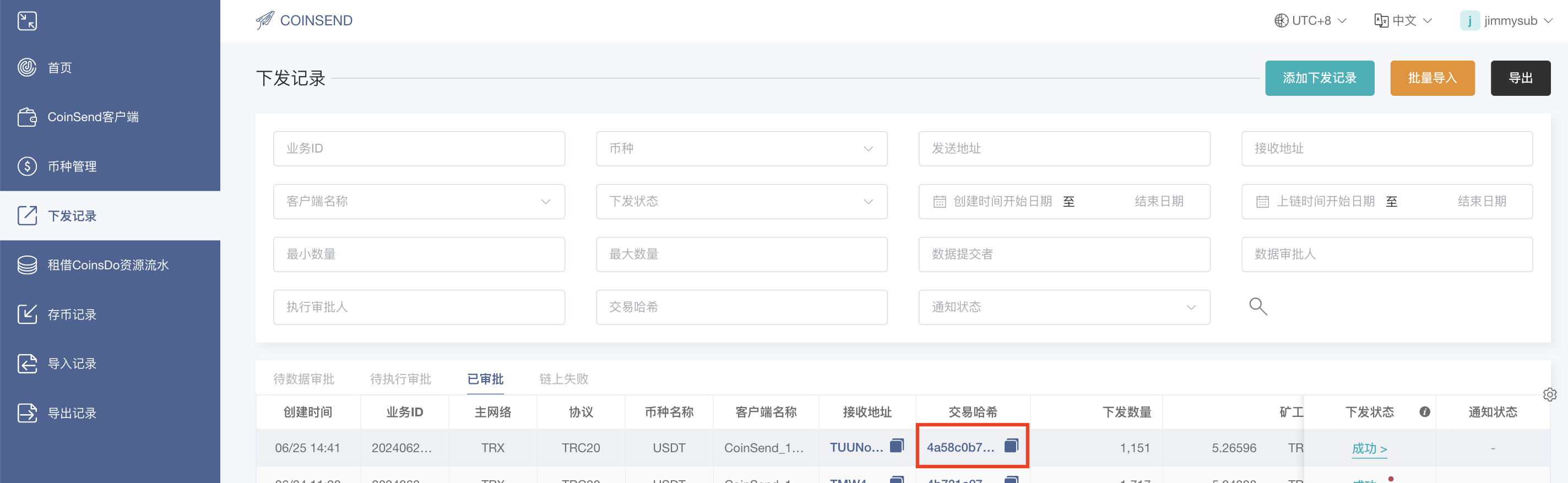 <figure><img src="https://254105150-files.gitbook.io/~/files/v0/b/gitbook-x-prod.appspot.com/o/spaces%2Fx1sJpsLJyJ12eTG1bUgP%2Fuploads%2F652vGcK3rkg3veoIkQQu%2FCoinSend_%E4%B8%8B%E6%94%BE%E8%AE%B0%E5%BD%95_%E5%B7%B2%E5%AE%A1%E6%89%B9_%E4%BA%A4%E6%98%93%E5%93%88%E5%B8%8C.png?alt=media&#x26;token=9695a374-a25c-4c42-8791-8dd2b641fa36" alt=""><figcaption></figcaption></figure>