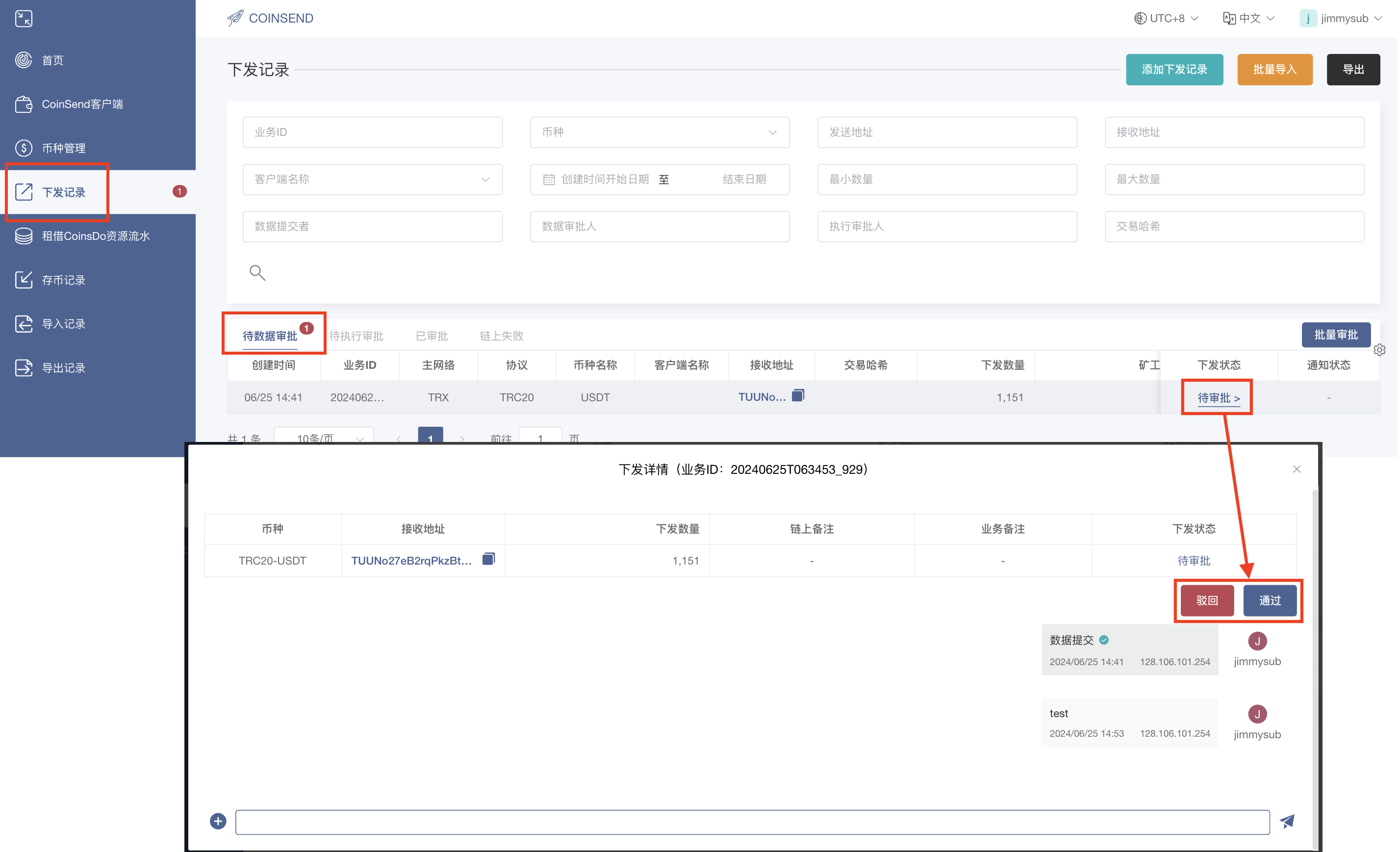 4. 拥有执行审批权限的子账户可以点击“待执行审批”列表内下发记录的“审批中”链接，并在下一步选择“通过”、“驳回”或“重审”此下发记录。欲通过此下发记录前，执行审批人必须点选先CoinSend客户端。点击“重审”的话，此下发记录将退回“待审批”状态，再次交由数据审批人通过或驳回