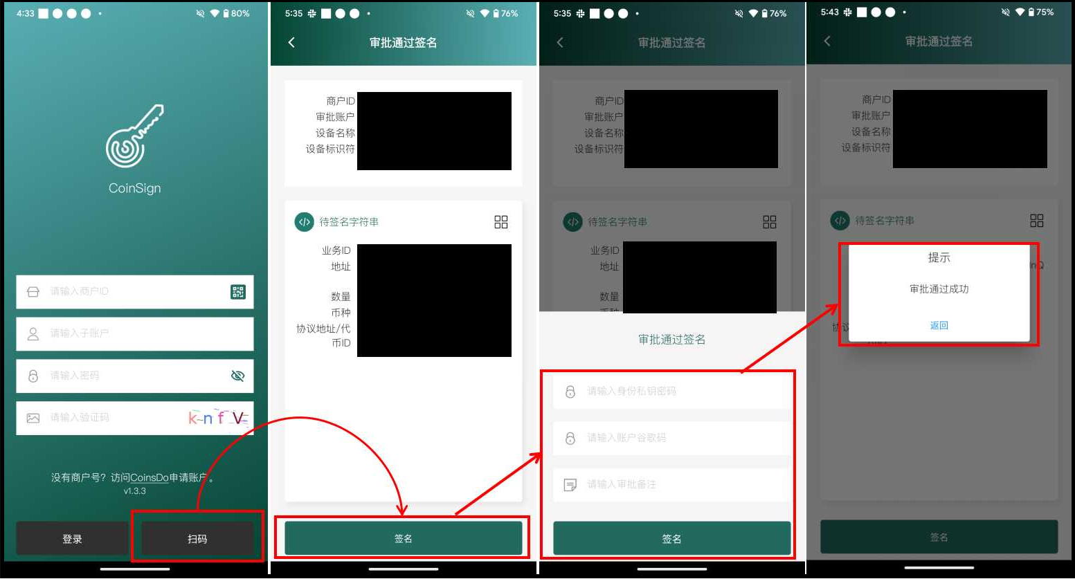 \> 数据审批人员可以打开CoinSign（点击[这里](https://coinsdo.gitbook.io/docs/cn/coinsend/zhu-yao-she-zhi/tian-jia-zi-zhang-hu-ji-bang-ding-coinsign-she-bei)了解如何下载CoinSign及为子账户绑定CoinSign）手机App并点击“扫码”扫签名二维码\