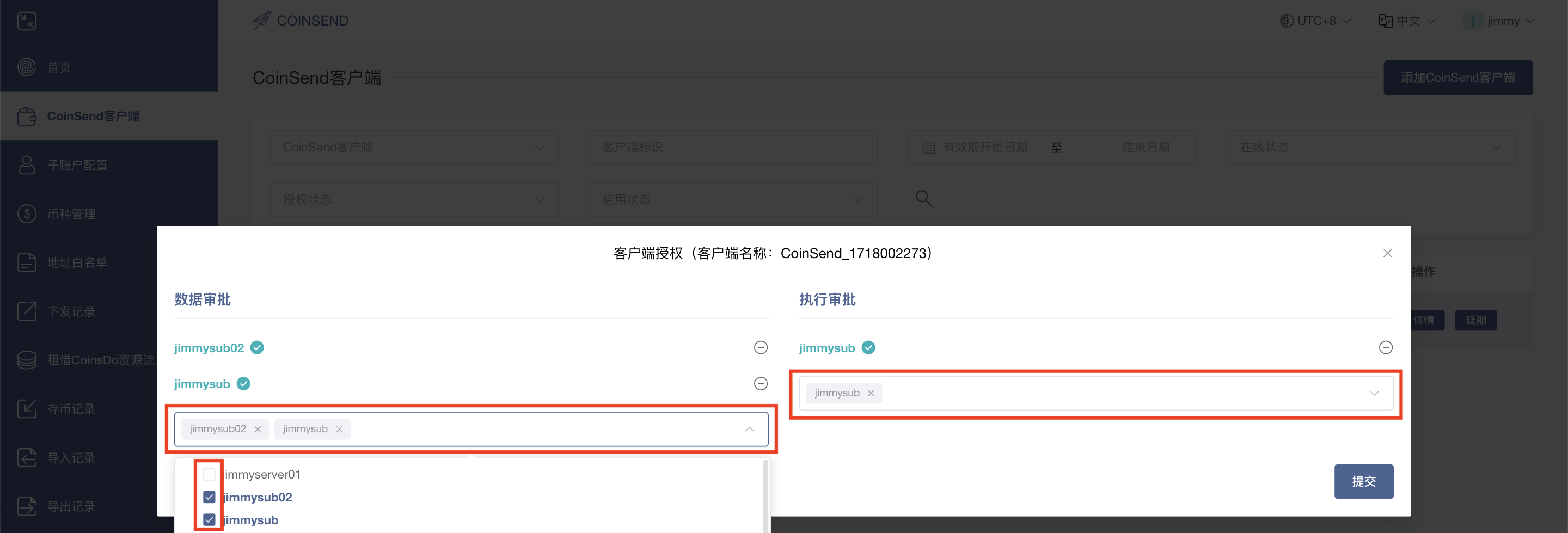 2. 在数据审批和执行审批的下拉菜单里选择所需子账户（点击子账户旁边的小空格）然后点击”提交“按钮。审批流程为数据审批人必须先通过审批后，才交由执行审批人进行审批。