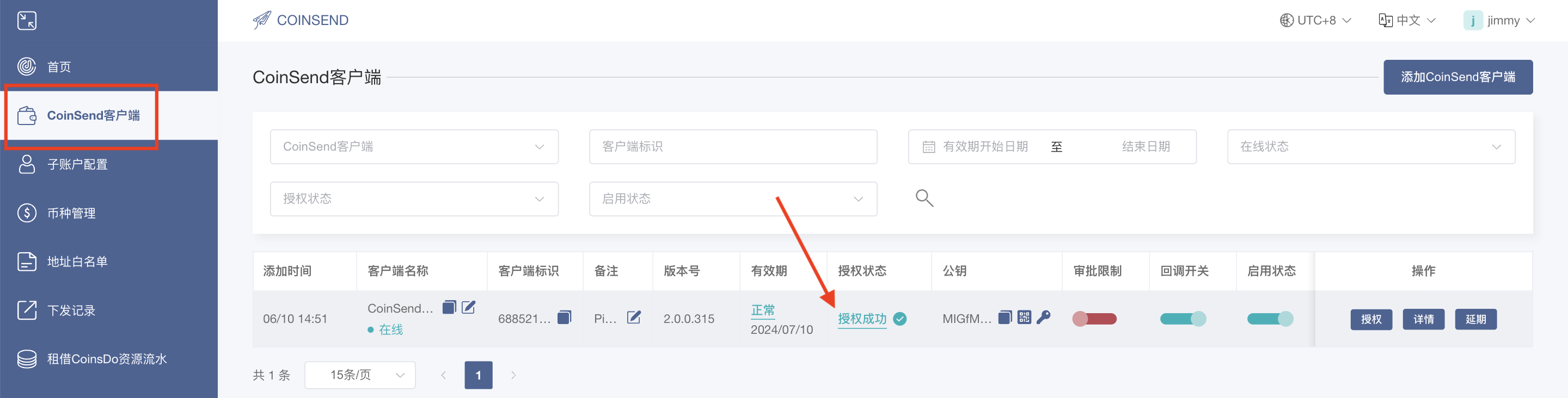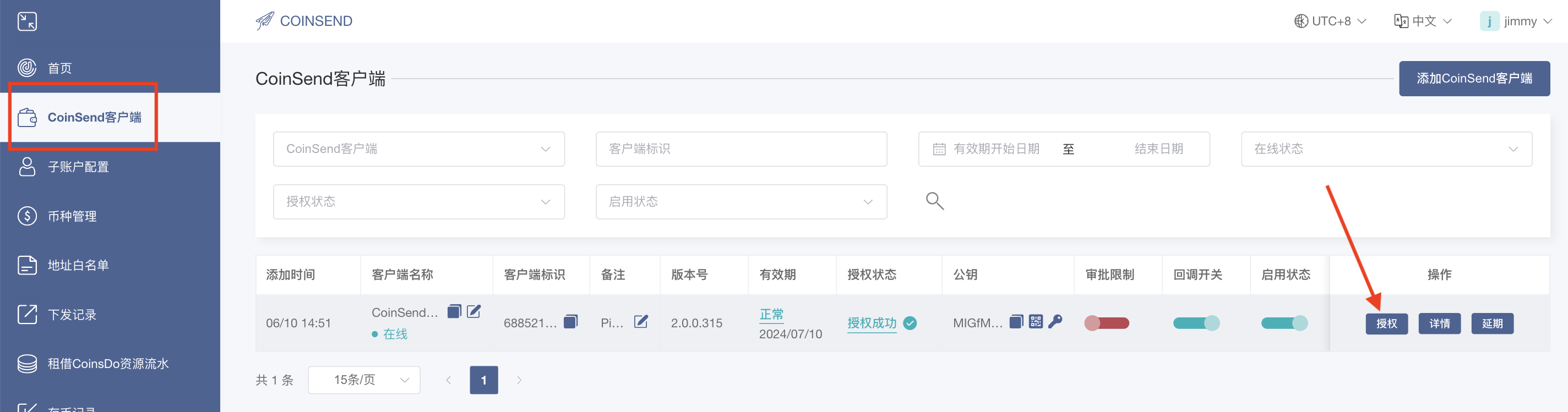 1. 在CoinSend客户端列表里，点击所需客户端的“授权”按钮
