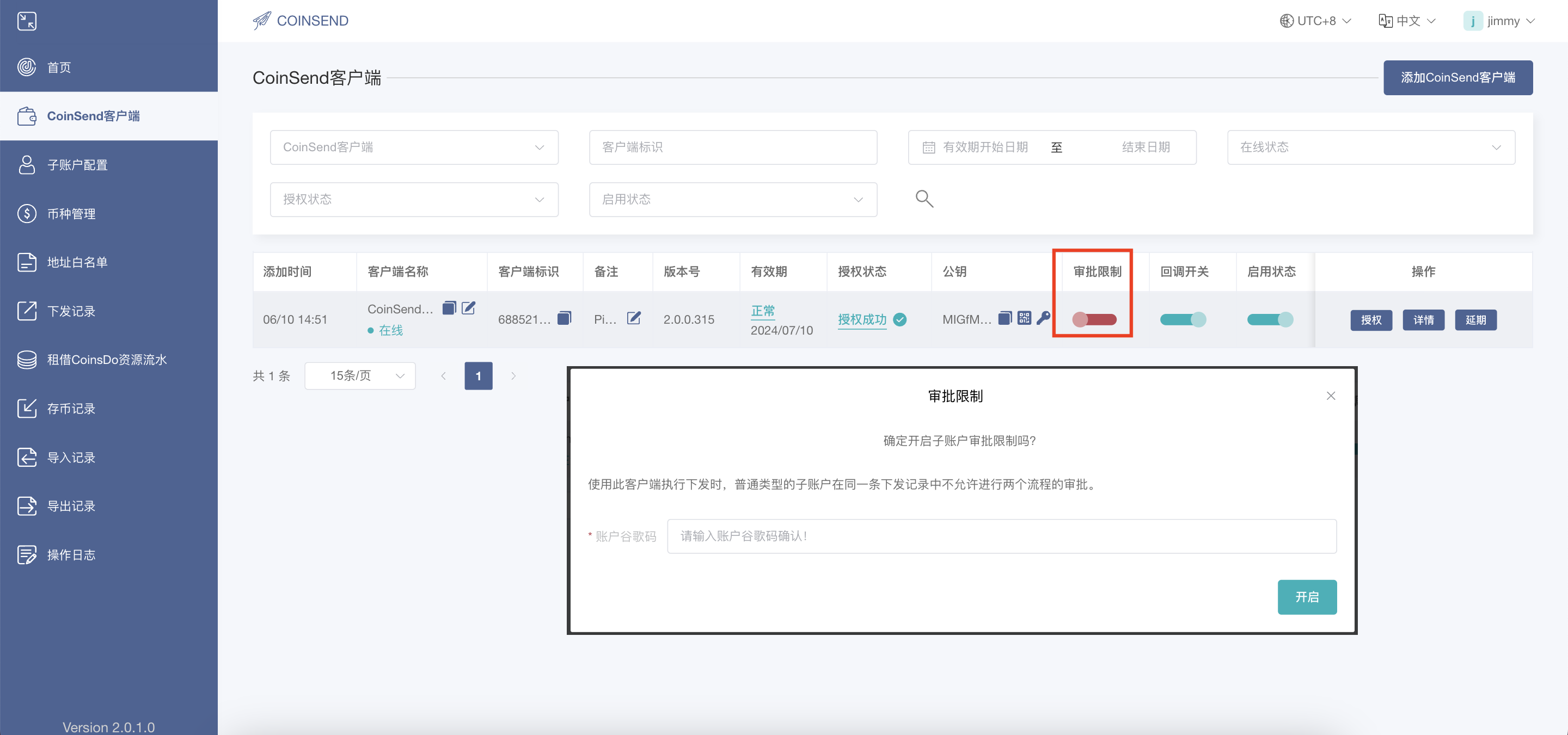 6. 若启动CoinSend客户端的“审批限制”机制（必须输入商户谷歌验证码），使用此此客户端时普通类型子账户将不能在同一条下发记录中同时进行数据审批和执行审批（只能执行其一审批动作）。