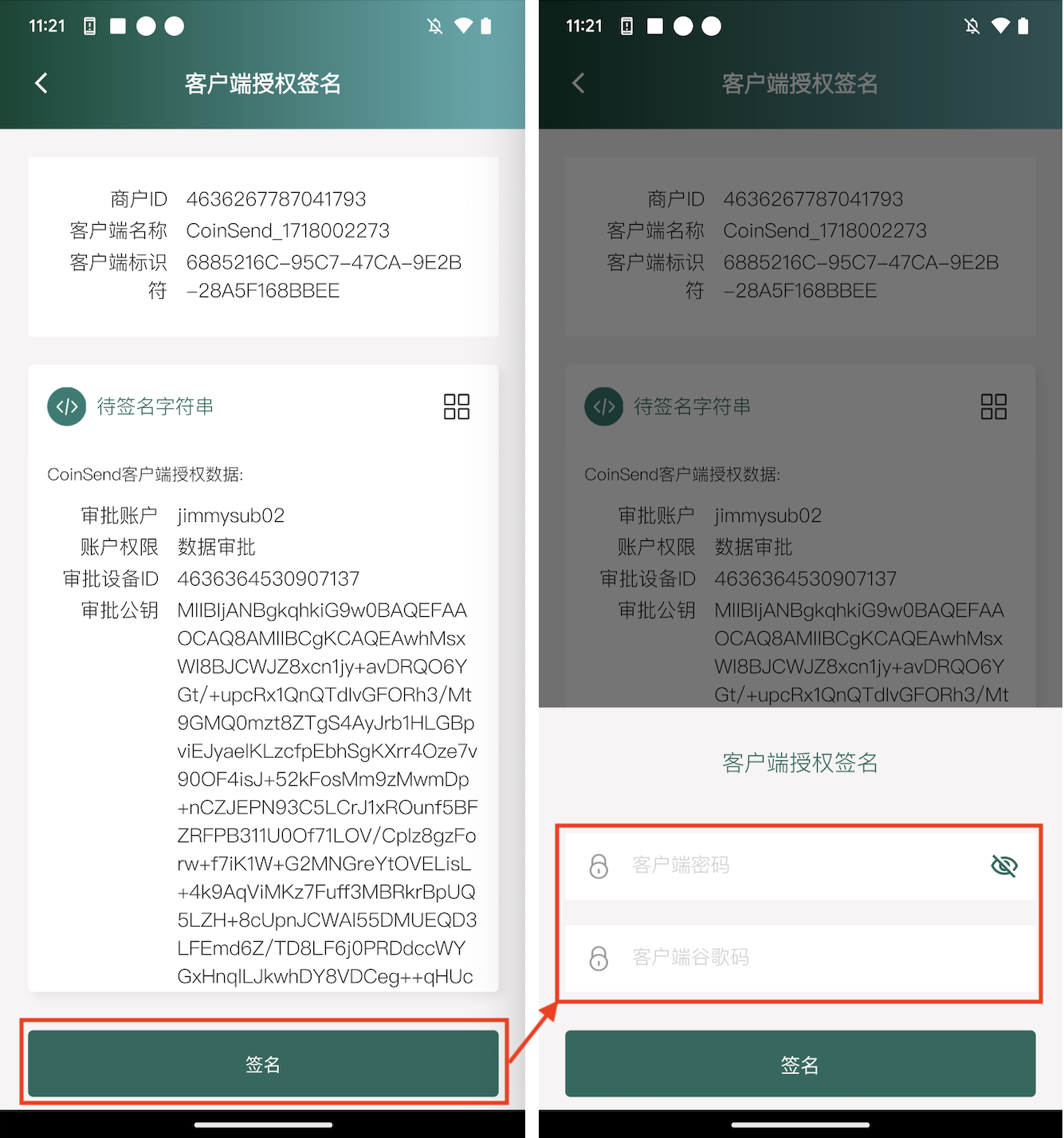 4. 点击“签名”按钮，查阅授权详情后输入客户端密码和客户端谷歌验证代码，然后再次点击“签名”按钮