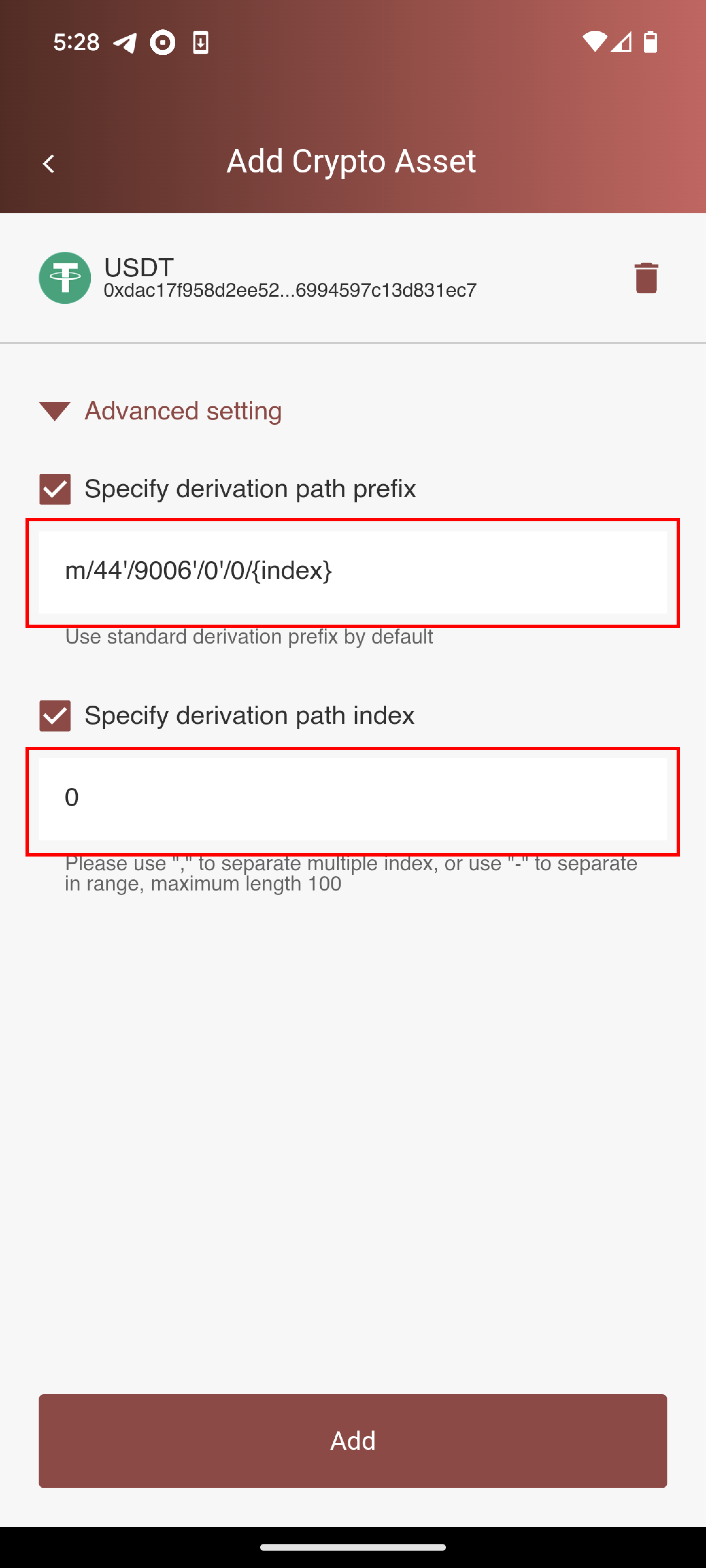 Custom derivation path prefix : m/44/9006'/0'/0/{index}&#x20;